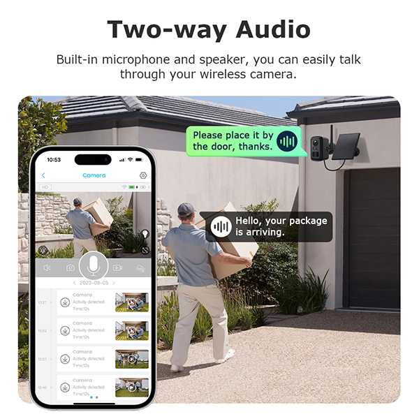 Built-in Li-ion battery (8000mAh) + 3W solar panel for continuous battery life |
